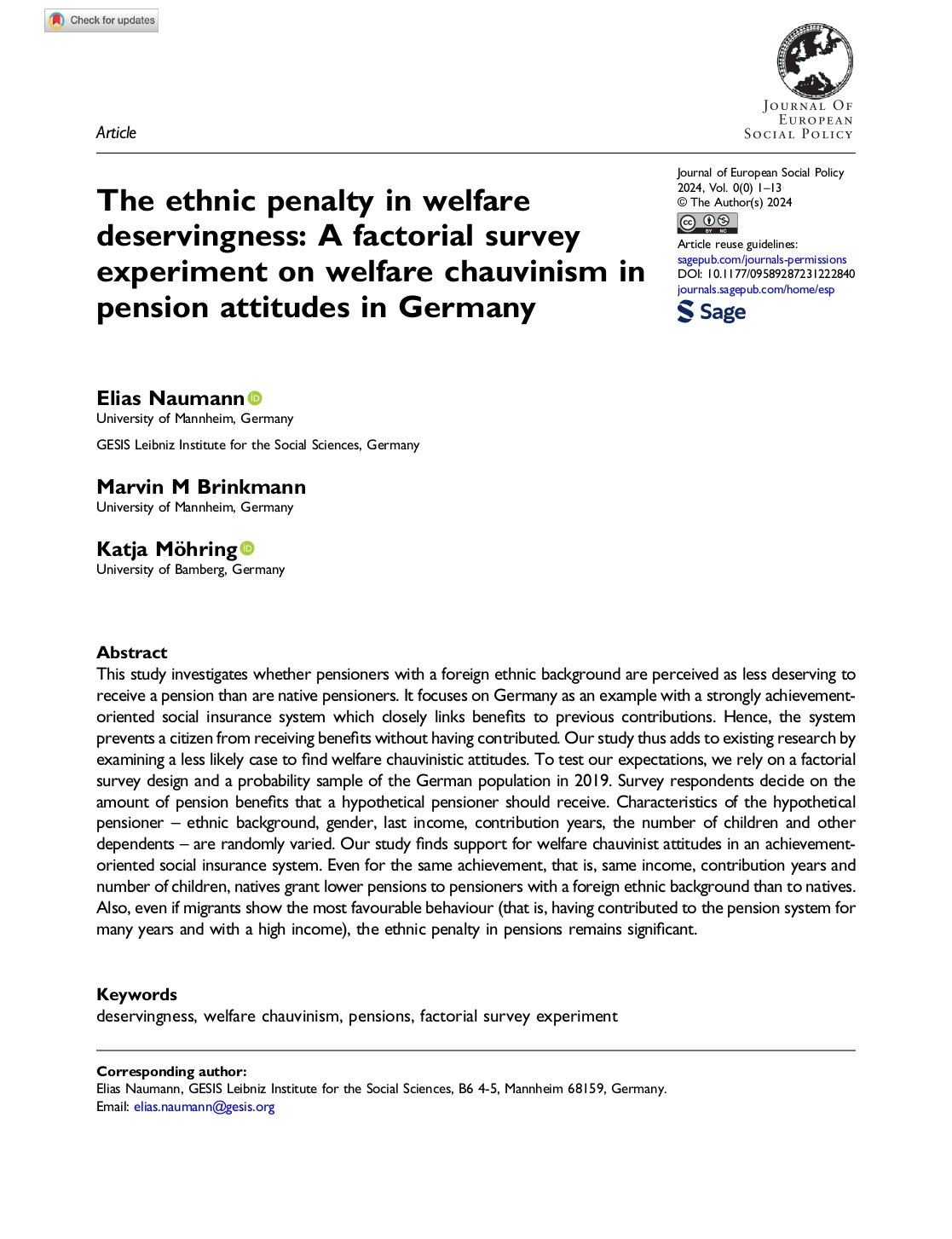 The ethich penalty in welfare deservingness: A factorial survey experiemnt on welfare chauvinism in pension attitudes in Germany, Journal of European Social Policy, 0(0), 1-13.